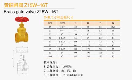 • 簡介: 黃銅閘閥Z15W-16T技術規范: 1.公稱壓力:1.6MPa; 2.工作介質:水,汽、油; 3.工作溫度:-20℃<1≤150℃; 洛陽遠大閥門有限公司銷售的全系列閥門產品主要采用中…